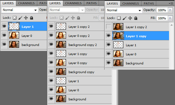 + E键,您将有5层。暂时关闭上层的知名度和工作的其他层(图层1副本)。