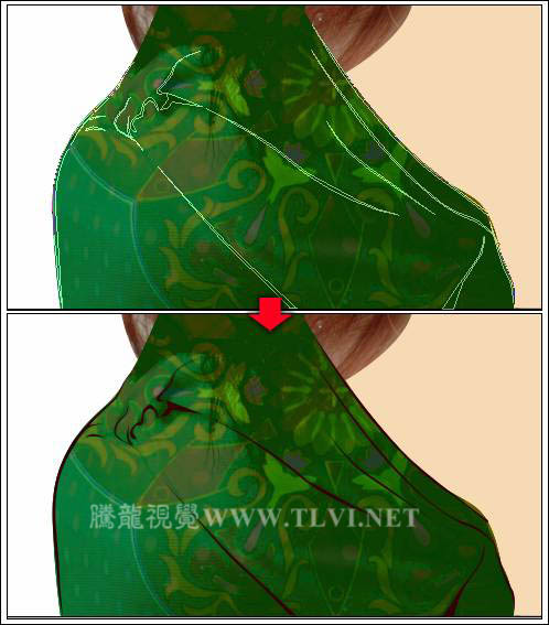 37、创建一个新图层,使用“钢笔”工具,在衣服图像上绘制褶皱图像的轮廓路径,将路径转换为选区后填充为深紫色(R51、G0、B6),然后将选区取消,如下图所示。