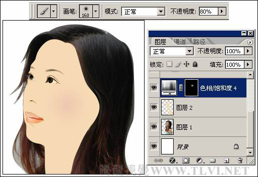 2”中的图像作为选区载入,然后再创建“色相/饱和度 5”调整图层,使用“画笔”工具,再对其蒙版进行编辑,勾勒出人物的立体感,如下图所示。