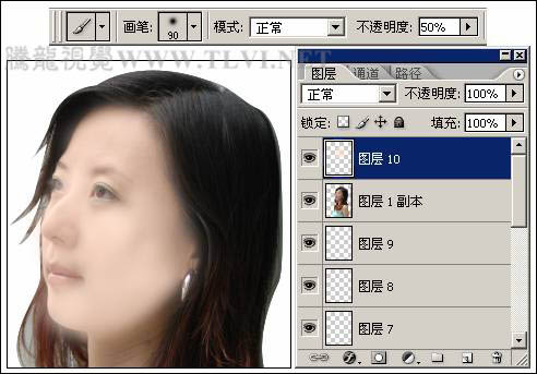 1”,创建“图层 1 副本”图层,然后将副本图层拖动到调板的顶端,接着新建一个图层。设置前景色为粉色(R255、G224、B206),使用“画笔”工具,在人物的脸上进行涂抹,如下图所示。