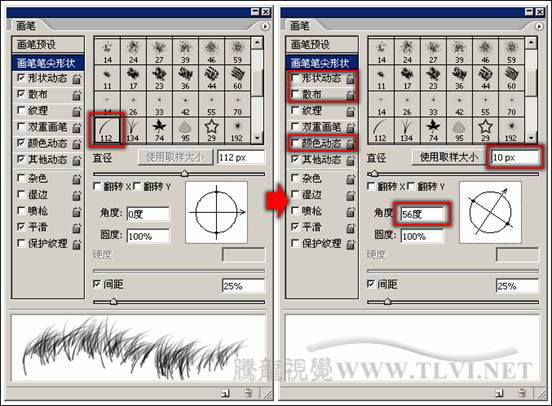 22、按下<Ctrl+D>键取消选区。选择工具箱中的“画笔”工具,执行“窗口”→“画笔”命令,打开“画笔”调板,参照下图所示设置“画笔”调板。