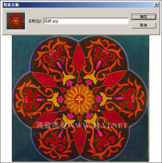 33、执行“文件”→“打开”命令,打开本书附带光盘\Chapter-04\“花纹.jpg”文件。执行“编辑”→“定义图案”命令,打开“图案名称”对话框,保持对话框的默认设置,单击“确定”按钮关闭对话框,将其定义为图案,如下图所示。