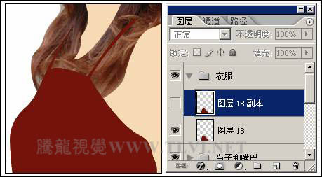 34、将“花纹.jpg”文档关闭,激活“工笔仕女画效果”文档。将绘制的衣服轮廓路径转换为选区,新建一个图层,然后使用紫红色(R115、G19、B11)将选区填充并取消选区。接着复制该图层,创建出一个副本图层,暂时将副本图层隐藏,如下图所示。
