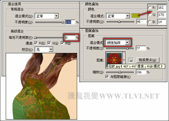18”,使该图层为当前可编辑状态,执行“图层”→“图层样式”→“混合选项”命令,打开“图层样式”对话框,参照下图所示设置对话框,为图像添加图层样式效果。