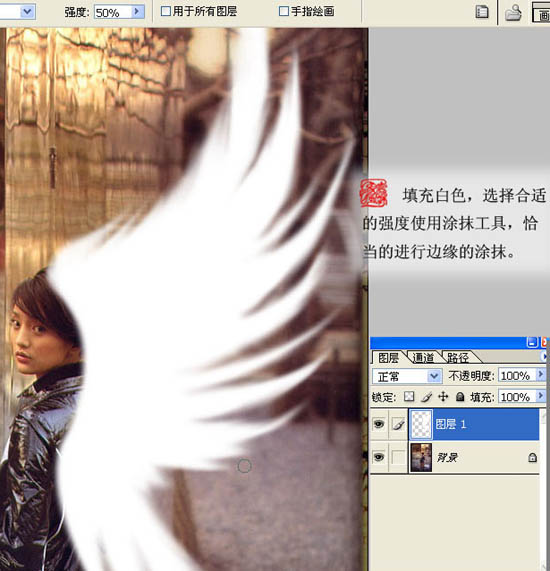 4、把选区填充白色,取消选区后选择涂抹工具,适当把边缘涂抹一下。