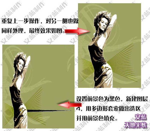 把前景颜色设置为黑色,新建一个图层,用多边形套索工具做出下图所示的选区后填充黑色。