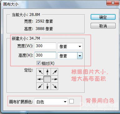 9、打开“图像—画布大小”,根据图片大小,扩大画布面积,背景色选白色。
