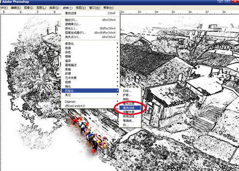 2、复制出一个图层,选菜单“滤镜”-“风格化”-“查找边缘”,得到一个线描的图层,再选菜单“图像”-“调整”-“去色”,用“色阶”加大图层的对比,设置图层混合模式为“叠加”,“不透明度”为80%。