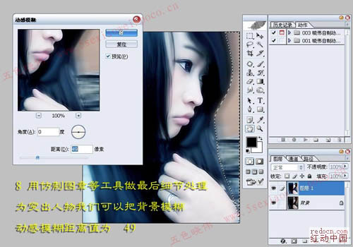 8、用仿制图章等工具做最后细节处理,为突出人物我们可以把背景模糊处理,用钢笔勾出背景部分选区,执行:滤镜