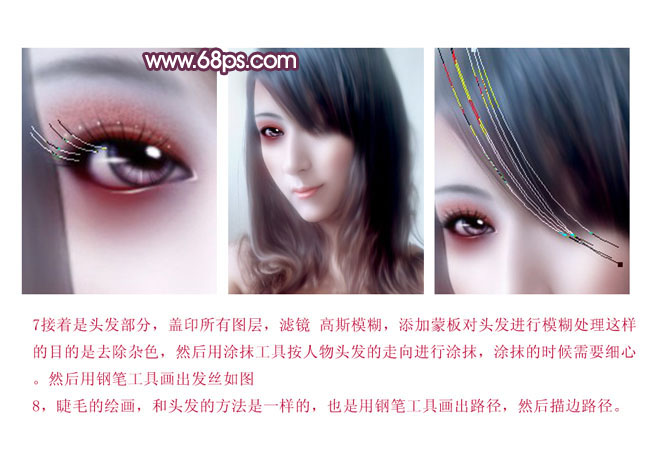 + Alt + Shift + E 盖印图层,执行:滤镜 > 模糊 > 高斯模糊,添加图层蒙版对头发进行模糊处理。这样处理的目的是去除头发部分的杂色。然后用涂抹工具按人物头发走向进行涂抹,涂抹的时候需要细心。然后用钢笔工具勾出发丝路径,用描边路径做出发丝。
