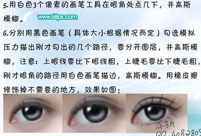 6)、分别用黑色画笔(具体大小根据情况而定)勾选模拟压力描出刚才勾出的几个路径,要分开图层,并高斯模糊。注意上眼线要比下压线粗,上睫毛要比下睫毛粗。刚才眼角的路径用白色画笔描边,适当高斯模糊。用橡皮擦修饰掉不需要的地方,效果如下图。