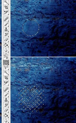 6、同样方法我们制作其他纹理,选择一个圆形区域,然后定义羽化,羽化值为15像素,然后按Q进入快速蒙板,执行彩色半调滤镜设置半径为10像素,其他同上,按Q退出快速蒙板,复制选区,粘贴到制作图音响左下角的喇叭半调图上。