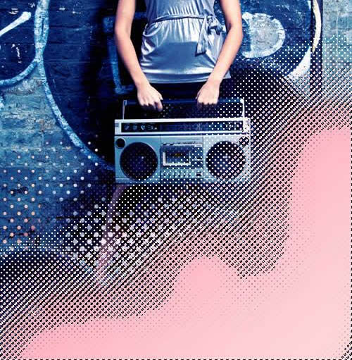 11、按Q退出快速蒙板,创建一个粉红色的渐变,并从图像左边沿底部向右画出如图所示的色块,将其放在喇叭图层的上方,音响图层的下方,图层模式改为滤色,效果如下。