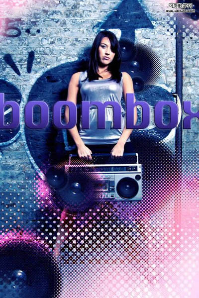 18、为了让效果更加好看,我们添加一些其它原色,这里主要添加一些字符,X,然后设置字母的渐变,添加样式,调整大小,复制,角度,放在音响周围,再做一些粉红色调的半调图案,最终效果如下。