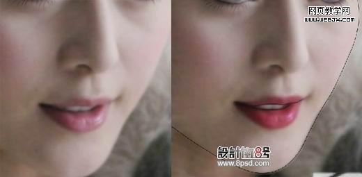 6、嘴巴上色,新建图层,选择喜欢的颜色,按嘴巴的形状用柔角画笔来涂,改图层模式为叠加,调下不透明度,要不颜色会很重。选择比嘴巴要深的颜色,在用钢笔在嘴巴内侧勾一圈轮廓线,描边,不要勾选模拟压力。顺便新建图层,勾一下脸部的轮廓,效果如图。