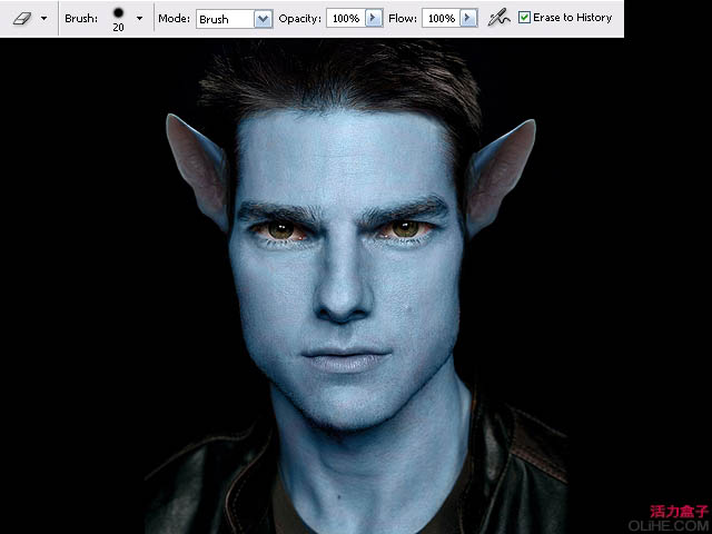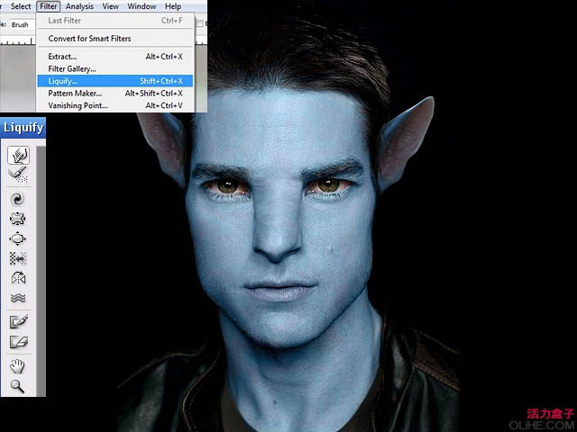 使用“矩形选框工具”,并选择鼻子和它周边的区域。从主菜单选择“滤镜”,并去“液化…”。一个新的窗口打开,你可能要放大一点。选择“向前弯曲工具”——“笔刷密度”和“笔刷压力”设置为100。现在,纳威人的鼻成型了。如果你做错了,可以使用“重建工具”。它可能看起来有些奇怪,但这也没什么,点击“确定”,它看起来应该像下图。