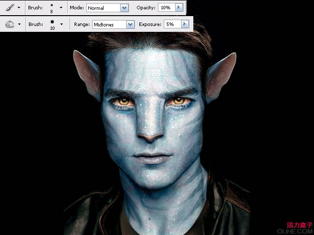 12、在该模式下点缀脸部,使用“加深”工具——中间调和阴影,以及“画笔工具”