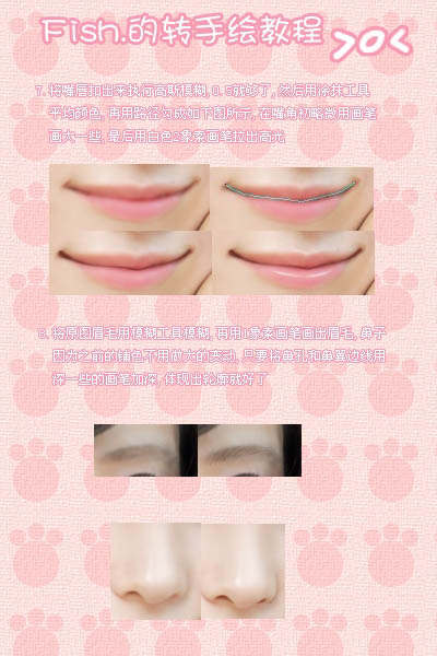8、将原图的眉毛用模糊工具模糊,再用1像素画笔画出眉毛,鼻子因为之前的铺色不做大的变动,只要将鼻孔和鼻翼边线用深一些的画笔加深,体现出轮廓就好了。