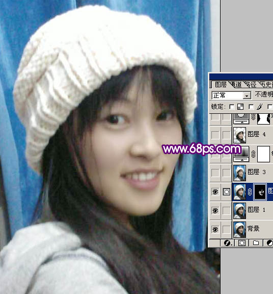 + Alt + Shift + E 盖印图层。执行:滤镜 > 模糊 > 高斯模糊,数值为4,确定后按住Alt键加上图层蒙版,然后用白色画笔涂抹人物脸部有杂色的部分。大致效果如下图。