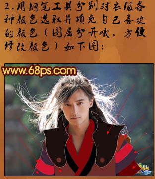 2、选择钢笔工具分别对衣服各种颜色选取并填充自己喜爱的颜色。填色时候一个图层填充一种颜色,方便修改。效果如下图。