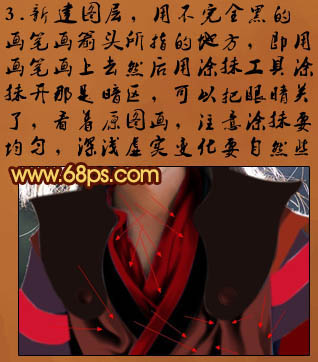 3、新建一个图层,用不完全黑色画笔画箭头所指的地方,即用画笔画上去然后用涂抹工具涂抹暗区,可以把图层关闭看着原图画。注意涂抹要均匀,深浅虚实变化要自然。