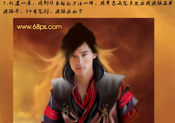 7、新建一个图层,用制作衣服的方法。用黄色画笔点,然后用涂抹工具涂抹。笔刷选择59号笔刷,涂抹后的效果如下图。