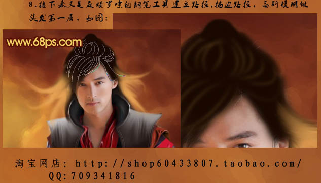 8、接下来就是用钢笔工具建立头发路径,描边路径,再适当高斯模糊做头发的第一层如下图。