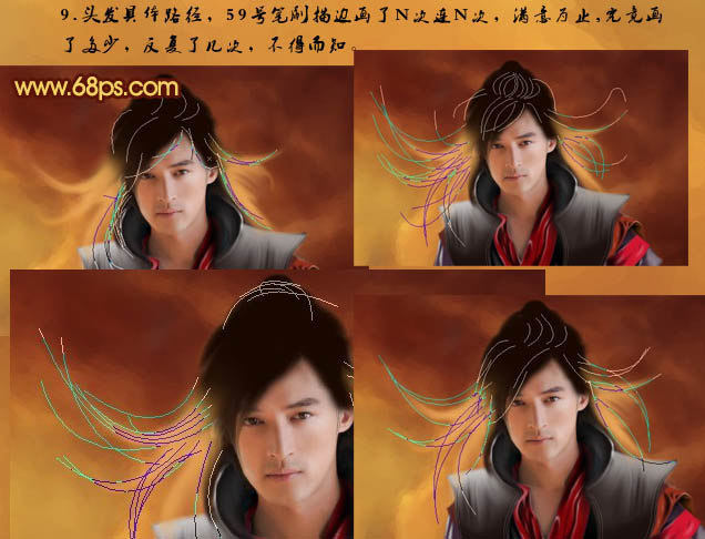 9、头发具体路径如下图,再用59号笔刷多描边几次,满意为止。
