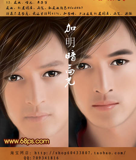 12、皮肤、嘴巴,鼻子等部位的处理。皮肤部分新建一个图层,把前景颜色设置为:%fed0b7,图层不透明度设为:41%,然后涂抹脸部的暗调部分。其它部分的处理方法相同。基本操作完成。