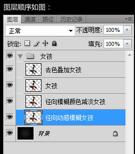 把“径向颜色减淡女孩”图层复制一层,放置在“径向颜色减淡女孩”图层下面,命名为“径向动感模式女孩”。执行:滤镜