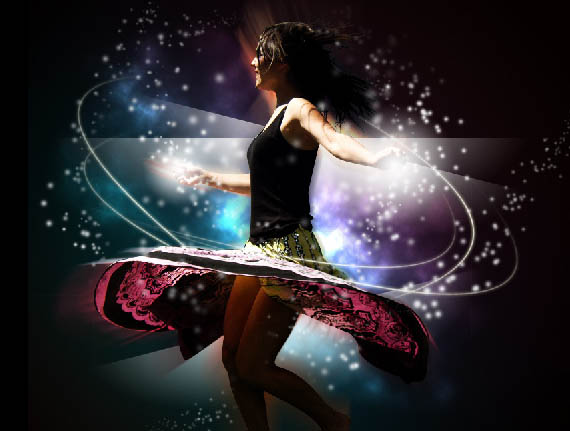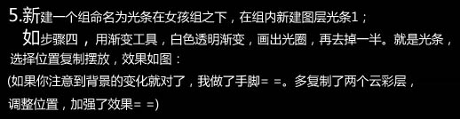 如步骤四,用渐变工具,白色透明渐变,画出光圈,再去掉一半就是光条。选择位置复制摆放,效果如下图: