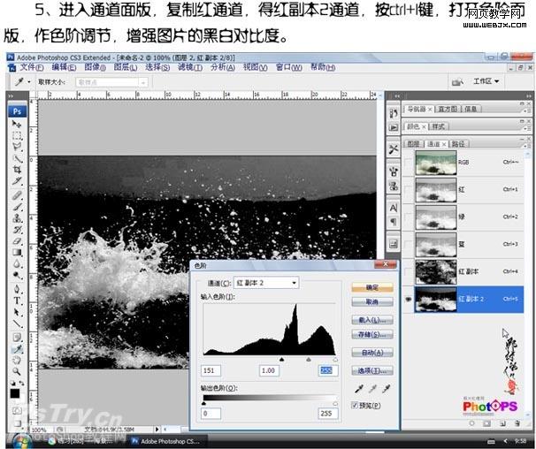+ I 反选,打开色阶面板,做色阶调节,增强图片的黑白对比度。