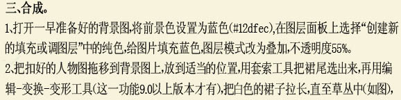 2、把扣好的人物图拖到背景图层上,放到适当的位置,用套索工具把裙尾选出来,再执行:编辑 > 变换 > 变形。把白色的裙子拉长,直至草丛中。