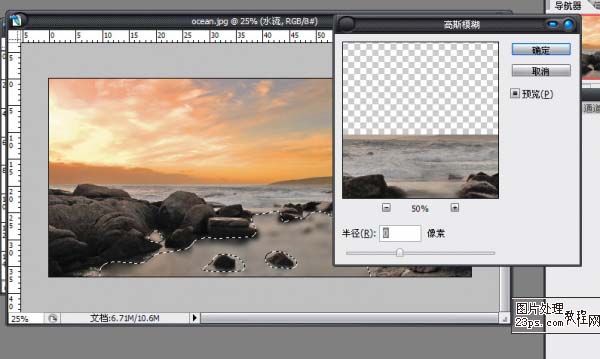 6、接下来的步骤就是做模糊滤镜了,选中水流图层,”滤镜“---”模糊“----“高斯模糊”,让水流变得虚幻点吧,不知道怎么形容差不多就是这个意思吧,模糊半径大概在8像素左右。