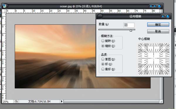 8、在水流1图层中使用”滤镜“----”模糊“---“径向模糊”数量调整为90左右,模糊方法为缩放,品质好。