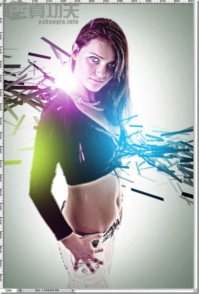 这样你将会把白色的材料变成黑色的。然后只要将混合模式改为正片叠底,这样,白色的背景将会变的完全透明。将图片放到合适的位置,如下图:
