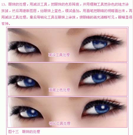 13、眼珠的处理,用减淡工具把眼睛的色彩降低,并用模糊工具把有杂色的地方涂抹掉,然后再建新图层,给眼珠上蓝色。模式为“叠加”。用画笔把眼睛的明暗画出来,再用减淡工具处理。最后用锐化工具在眼珠上涂抹,使眼睛的高光清晰可见。