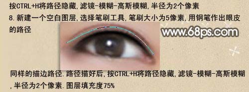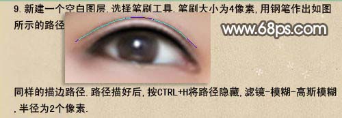 8、新建一个空白图层,选择笔刷工具,笔刷大小为5像素。用钢笔做出眼皮的路径。同样的描边路径。路径描好后,按Ctrl