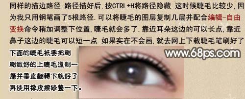 + H 将路径隐藏。这时候睫毛比较少,因为我只用钢笔画了5根路径,可以将睫毛的图层复制几层并配合(编辑 > 自由变换)命令稍加调整下位置。睫毛就会多了。靠近耳朵这边的可以长点。靠近鼻子的这边的睫毛可以短一点。如果实在不会画,就去网上下载睫毛笔刷好了。