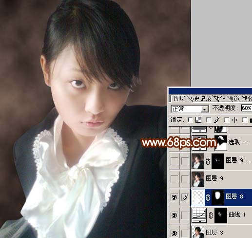 + Alt + ~ 调出高光选区,新建一个图层填充白色,把图层不透明度改为:60%,加上图层蒙版只保留人物脸部及皮肤部分,其它地方用黑色画笔擦掉,如图8。
