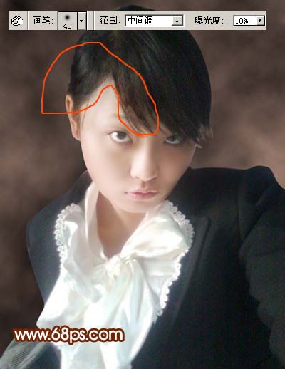 7、新建一个图层,盖印图层,选择加深工具,曝光度为:10%,把图9红圈位置头发部分加深一点,效果如图10。