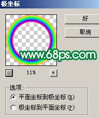 > 扭曲 > 极坐标,参数设置如图16,效果如图17,彩虹效果出来了。