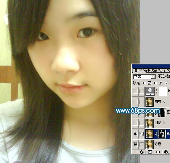 > 模糊 > 高斯模糊,数值为4,确定后按住Alt 键点图层面板下面的蒙蔽按钮,添加黑色图层蒙版。把前景颜色设置为白色,用画笔涂抹人物脸部有杂色的地方,给人物渐变磨皮,效果如下图。