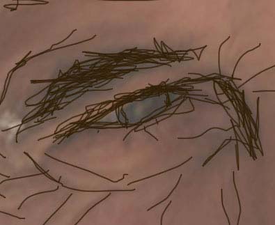 现在你需要给予线稿一些变化.更好的捕捉到人物的阴影部分,要做到这一点,你需要把图像原大显示,使用画笔沿着图像的阴影部分画出线条,看起来要像是线条覆盖了图像的阴影部分.当然这些操作依然要在"素描线稿"图层上执行。