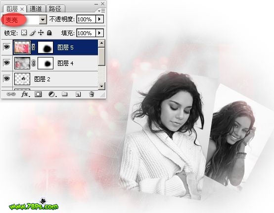 4、粉红光点素材图,拖进以上素材,模式变亮,添加蒙版,用黑色画笔在蒙版上擦出人物。