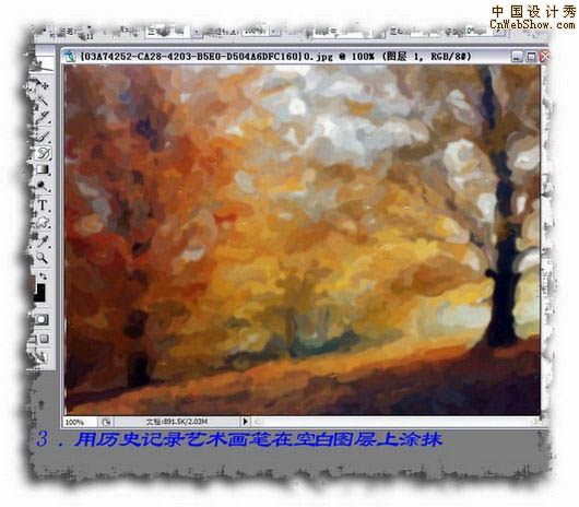3、用历史记录艺术画笔在空白图层上涂抹。