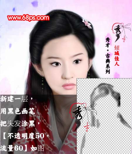 2、新建一个图层,用黑色画笔把头发涂黑,画笔设置:不透明度:50%,流量:60。