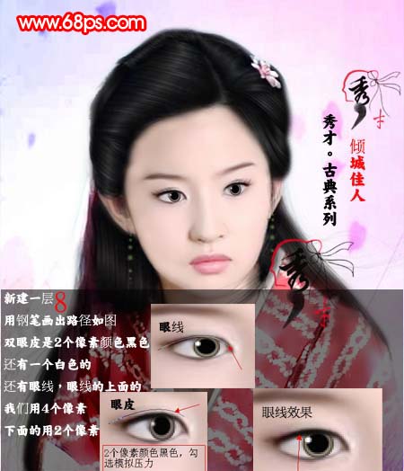 8、用钢笔画出路径如下图,开始制作双眼皮,方法如下图所示。