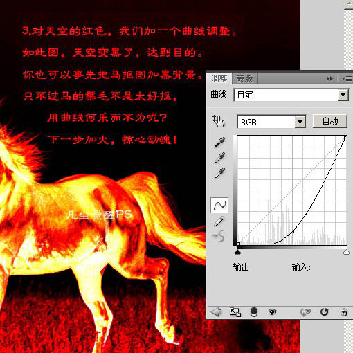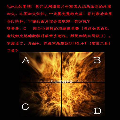 4、开始加火焰:我们从下图的火焰素材选取火焰来给马的外围加火。外围加火记住,一定要完整的火苗!否则最后效果会打折。然后用矩形选框工具选区下图C区部分。