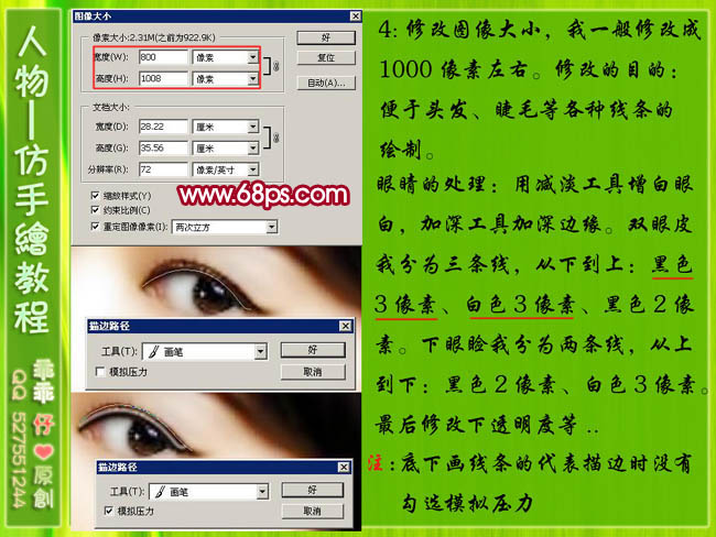 眼睛的处理:用减淡工具增白眼白,用加深工具加深边缘。双眼皮我分为三条线,从下到上:黑色3像素、白色3像素、黑色2像素。下眼睑我分为两条线,从上到下:黑色2像素,白色3像素。最后修改下透明度等。